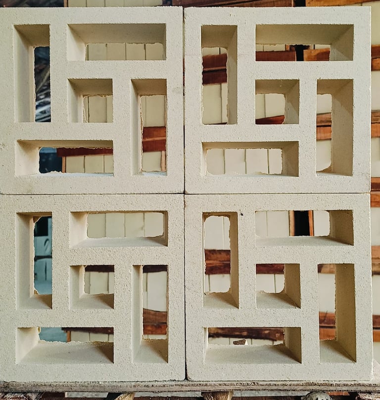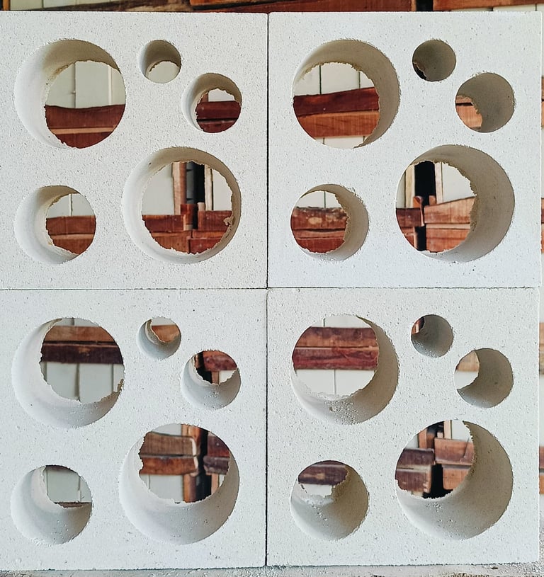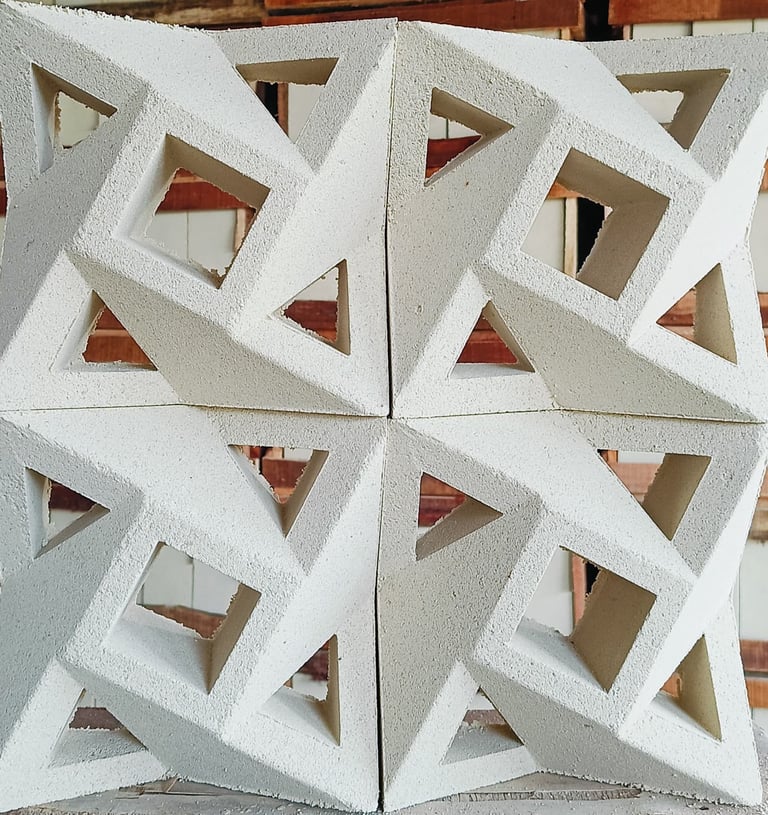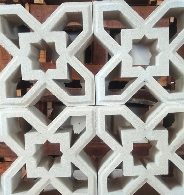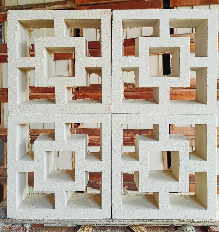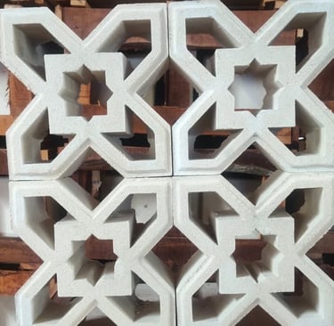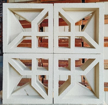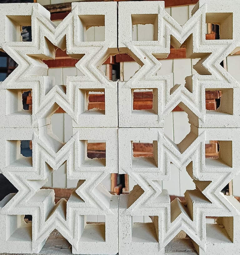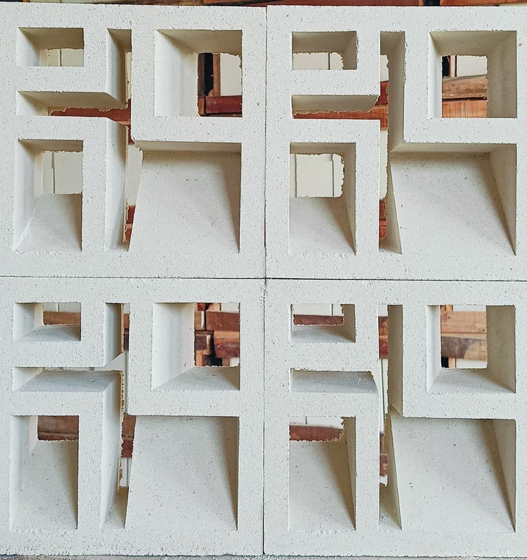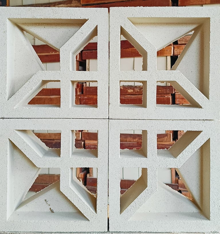Roster beton bermotif geometris modern dengan desain lubang asimetris, berfungsi sebagai ventilasi sekaligus mempercantik tampilan bangunan minimalis.