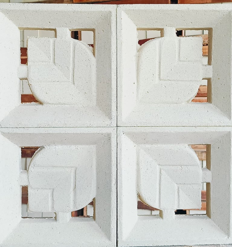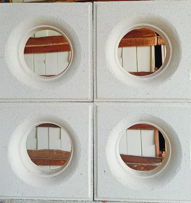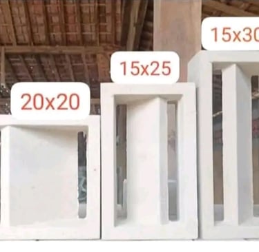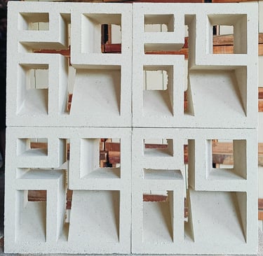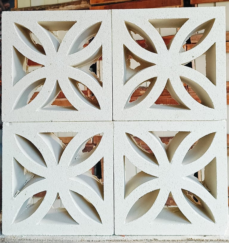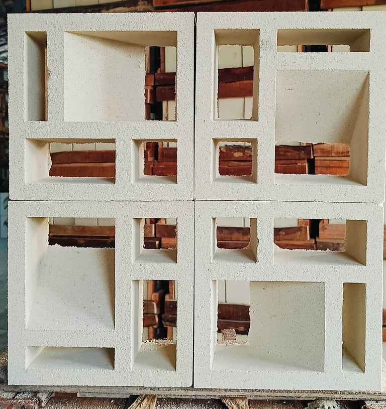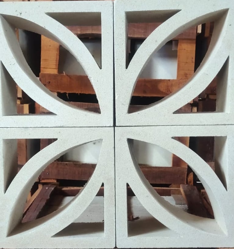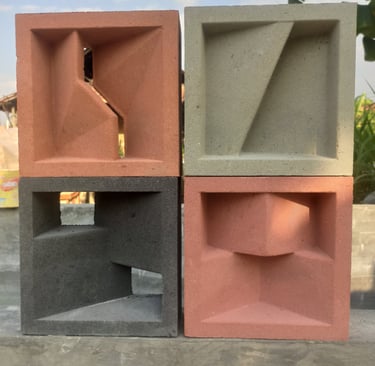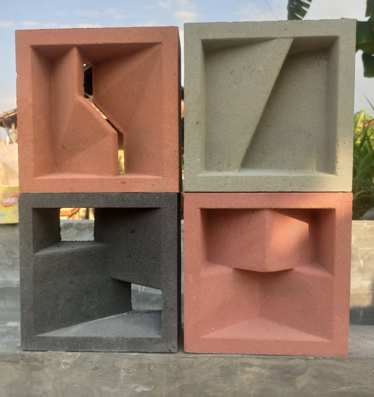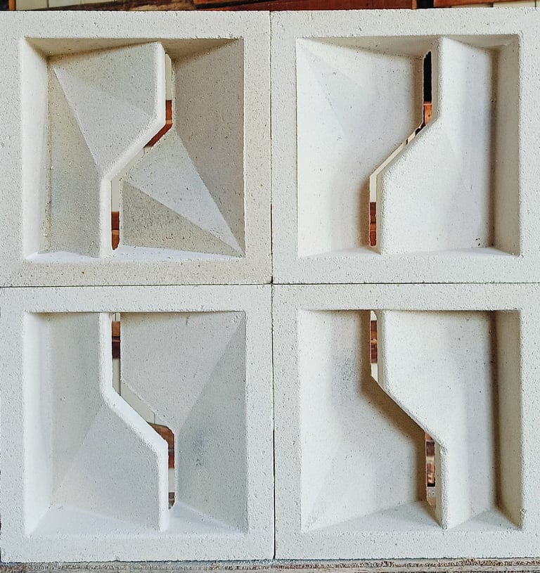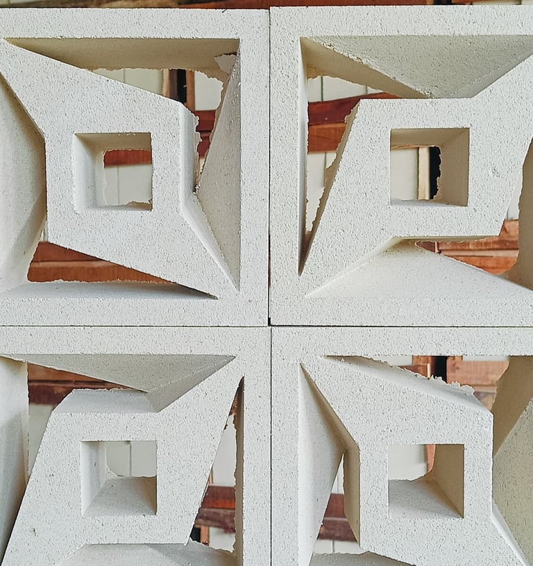 Roster beton bermotif geometris modern dengan desain lubang asimetris, berfungsi sebagai ventilasi sekaligus mempercantik tampilan bangunan minimalis.