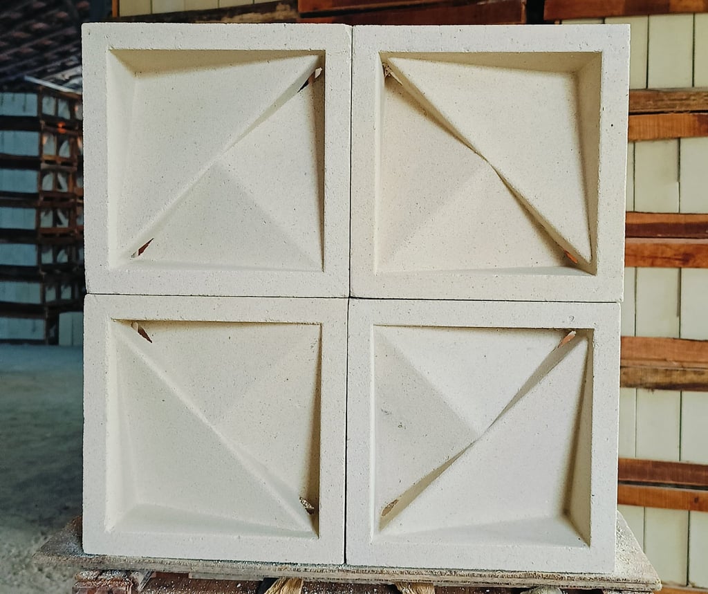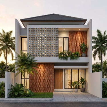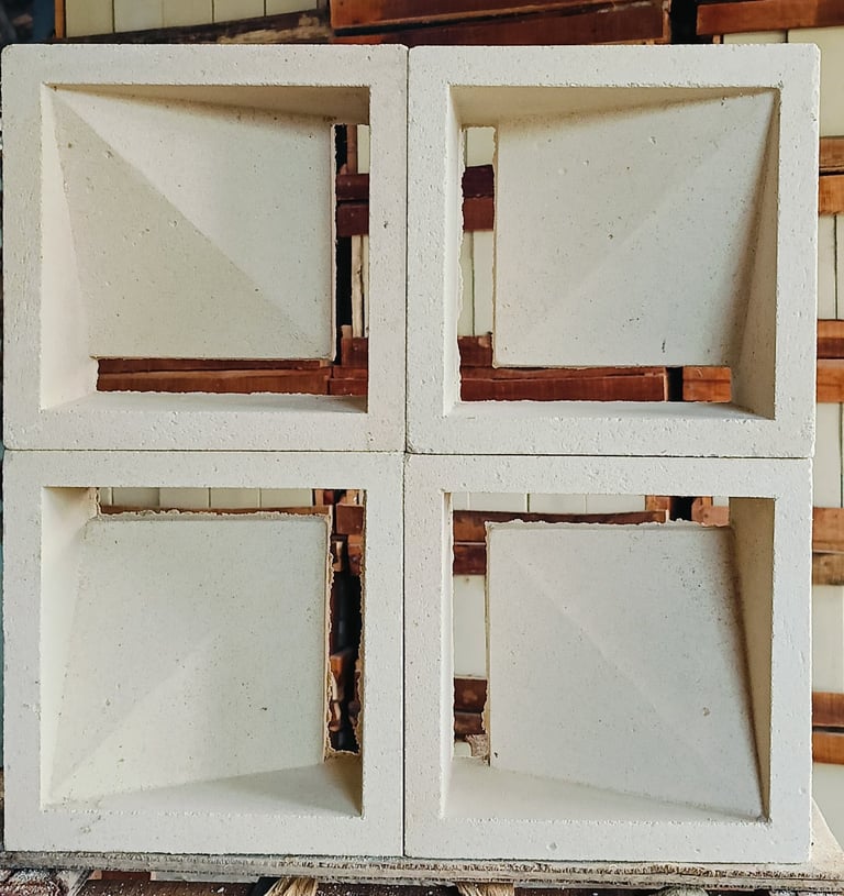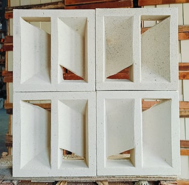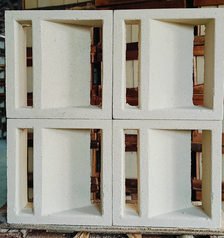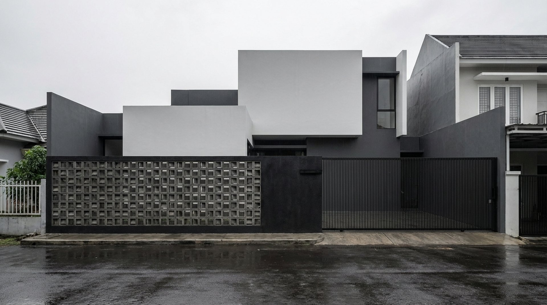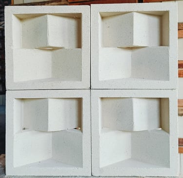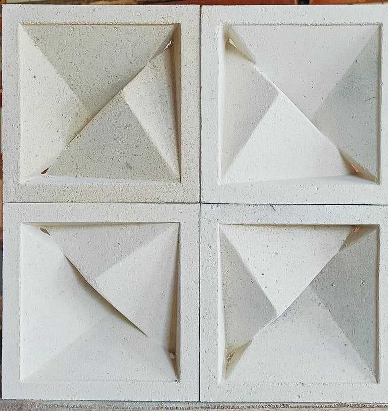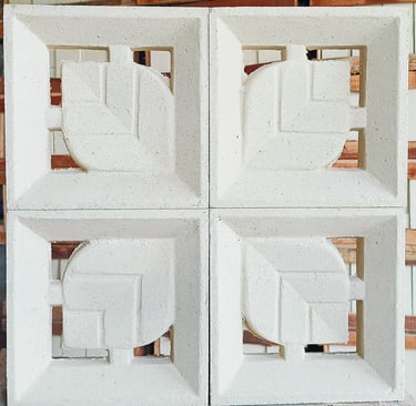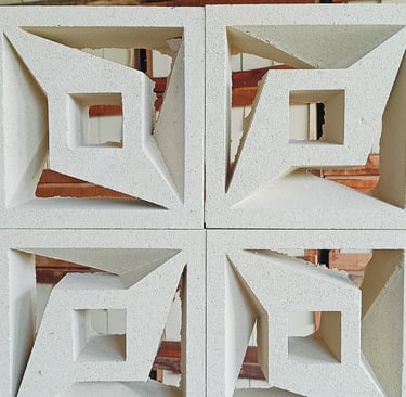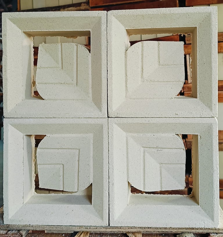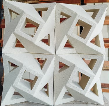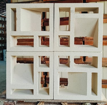 Roster beton bermotif geometris modern dengan desain lubang asimetris, berfungsi sebagai ventilasi sekaligus mempercantik tampilan bangunan minimalis.