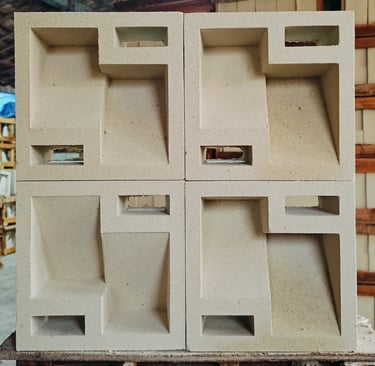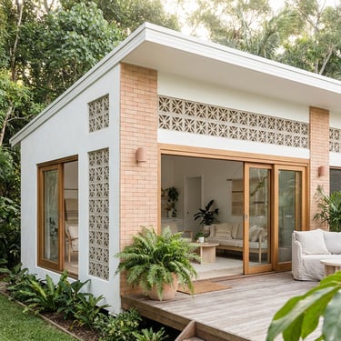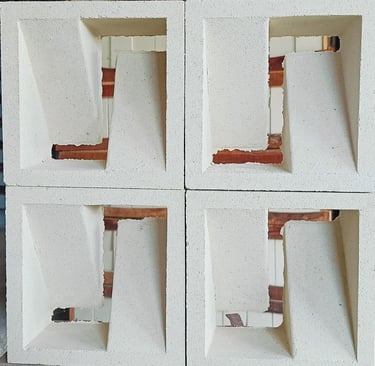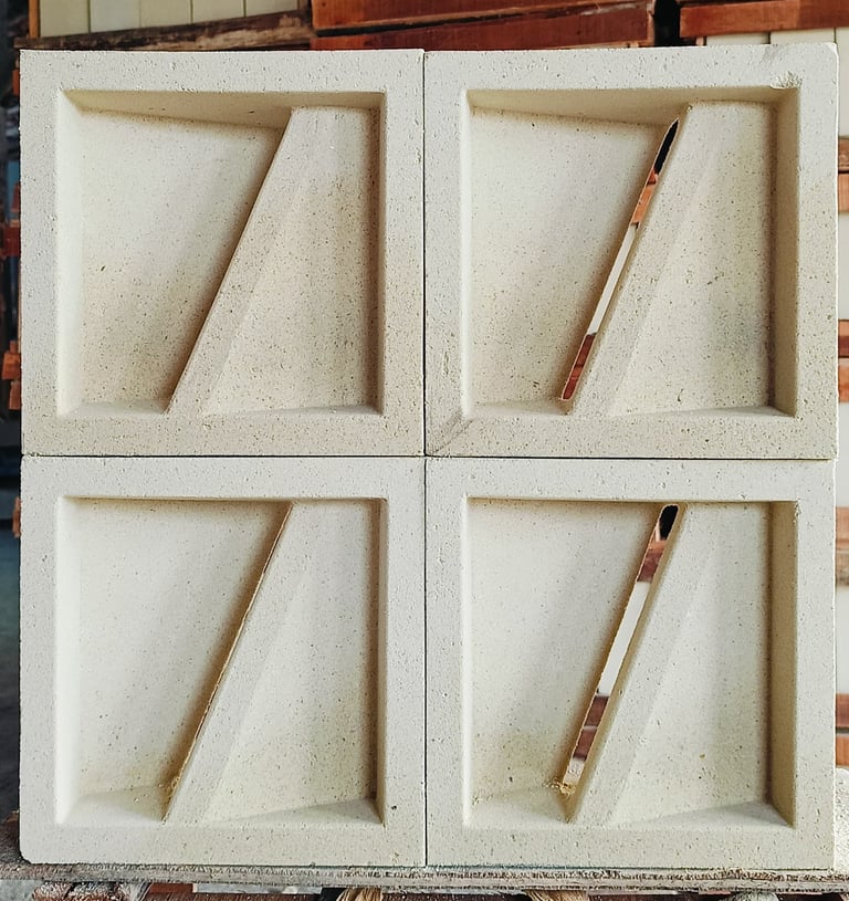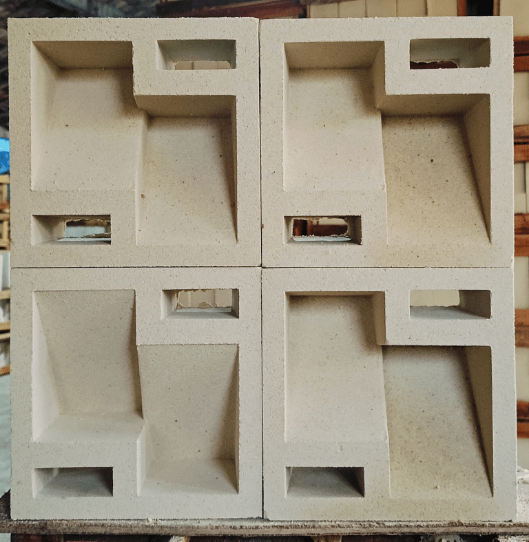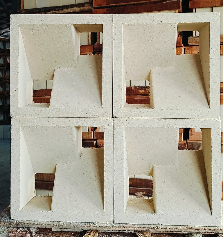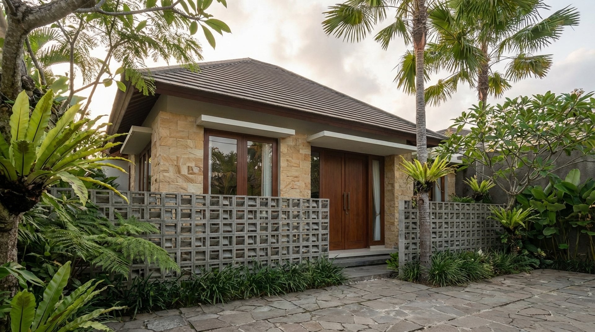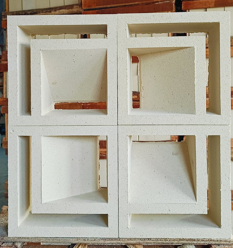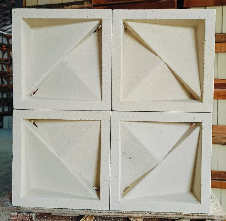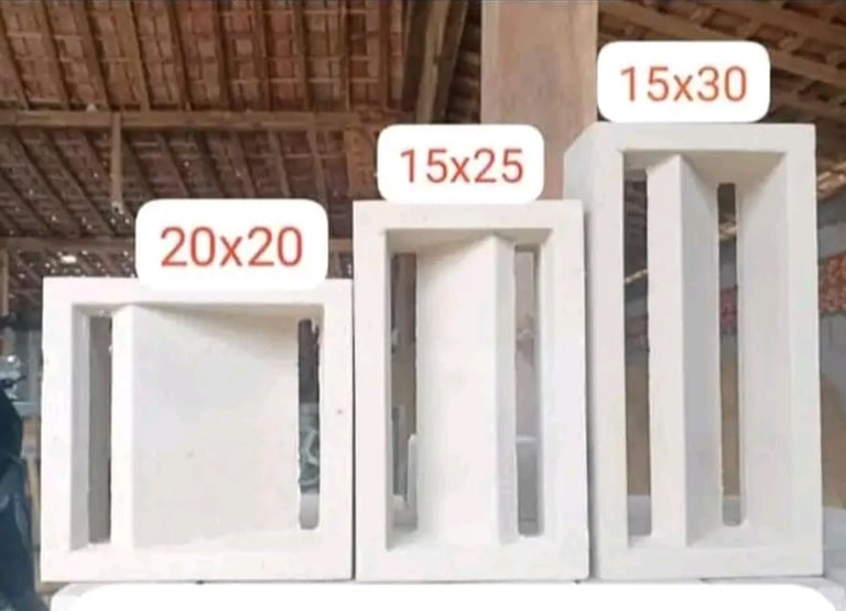 Roster beton bermotif geometris modern dengan desain lubang asimetris, berfungsi sebagai ventilasi sekaligus mempercantik tampilan bangunan minimalis.